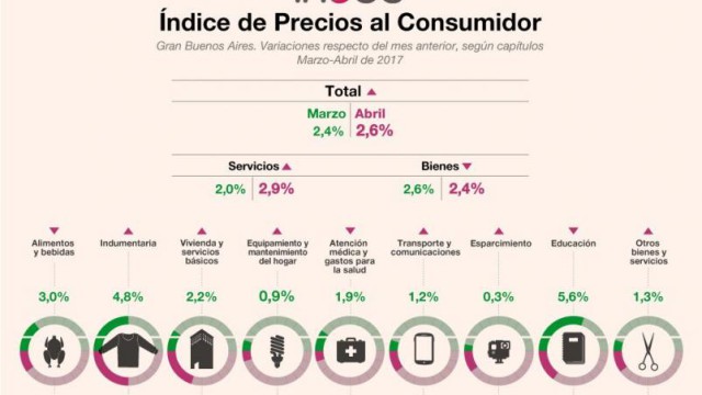 La inflación de abril fue de 2,6% y alcanzó 27,5% en los últimos 12 meses en el área metropolitana, según informó ayer el Instituto Nacional de Estadística y Censos ( Indec ). Los rubros que más subieron fueron los alimentos, 2,2%; indumentaria, 5,1%; vivienda y servicios básicos (por el aumento de la tarifa del gas), […]